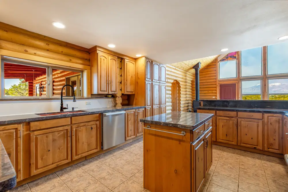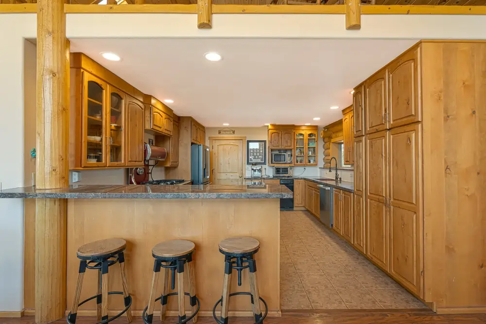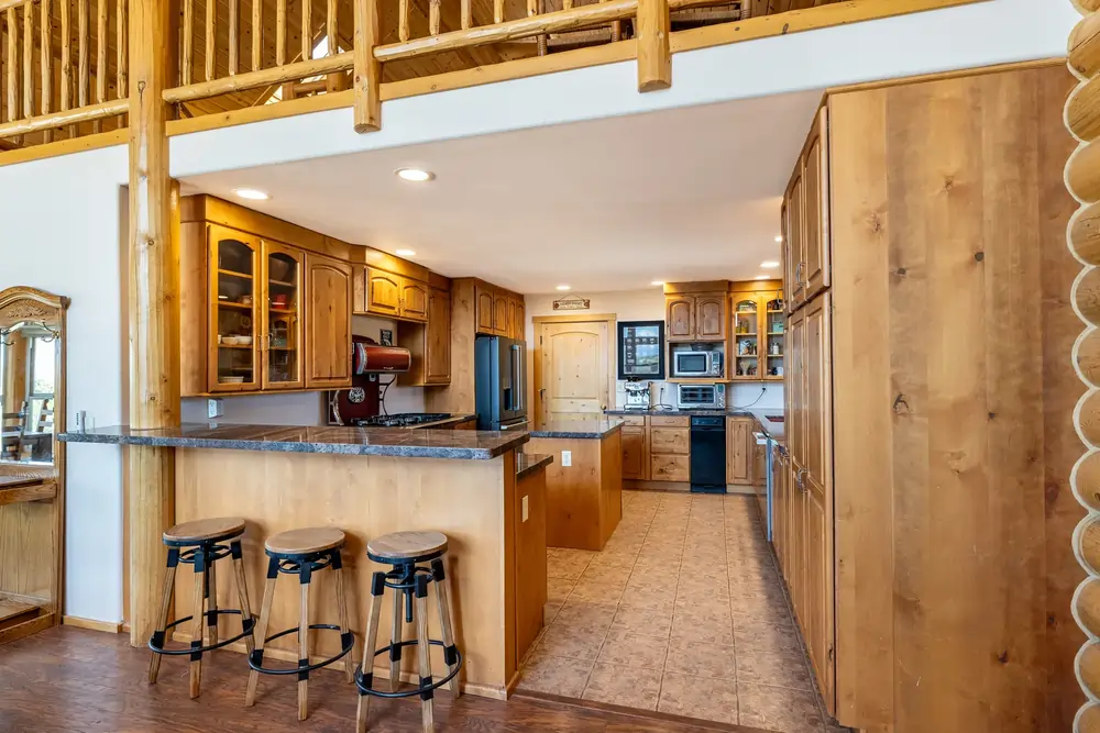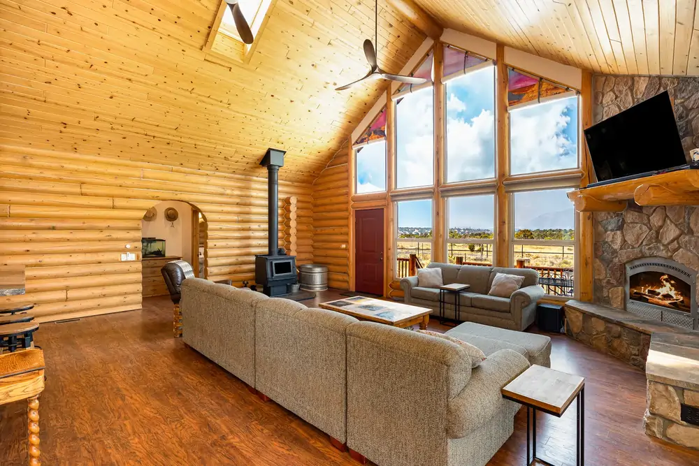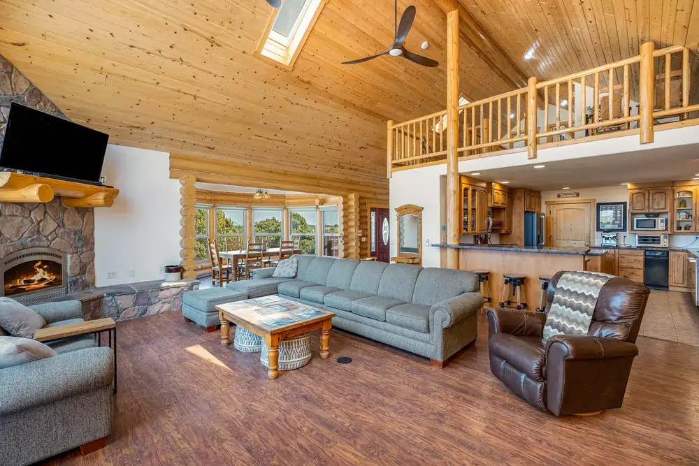 From the moment you arrive, you’ll be captivated by the tremendous curb appeal—gorgeous stone finishes, a light green metal roof, and the warm, inviting glow of logs —all set against the majestic backdrop of the San Francisco Peaks. It’s the kind of place that makes you slow down, breathe deeper, and know you’ve found home. Step inside the sun-drenched greatroom, where a wall of windows frames 180 degree breathtaking panoramic views of the San Francisco Peaks. Wake up to glorious sunrises, sip coffee in your greatroom or on your deck, and end the day with unforgettable sunsets. Enjoy the natural beauty of mountain views sitting cozily inside, or outside on the large deck as the day turns into magical twilight. A floor to-ceiling stone fireplace adds a beautiful rustic touch to the greatroom, and a separate dining area surrounded by its own wall of windows creates space to entertain or enjoy gathering with family, bringing the outdoors in from all angles.